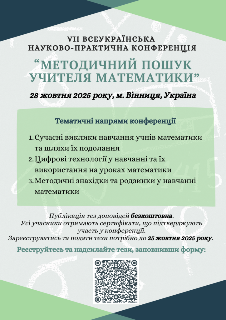 Запрошуємо Вас взяти участь у VІІ Всеукраїнській науково-практичній конференції «Методичний пошук учителя математики», яка відбудеться дистанційно 28 жовтня 2025 року на факультеті математики, фізики і комп’ютерних наук Вінницького державного педагогічного університету імені Михайла Коцюбинського.